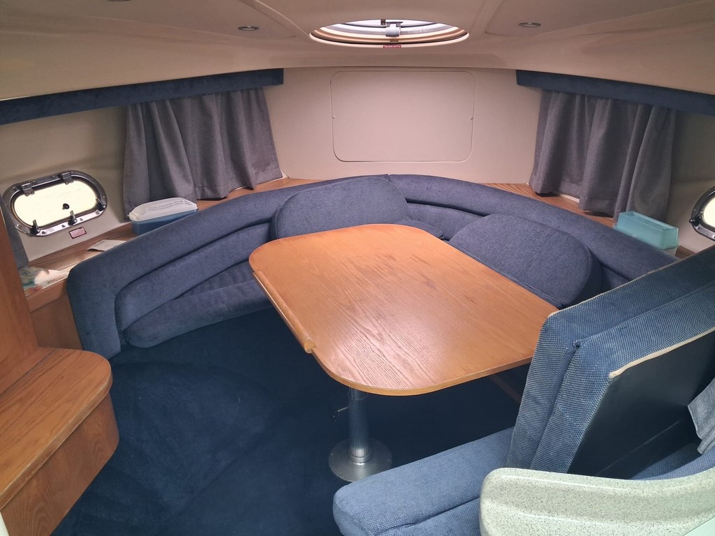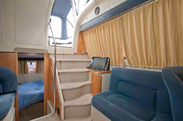 Aft cabin with en suite bathroom/wetroom with toilet, hand basin and shower. The forward seating and pedestal table convert into another double berth.