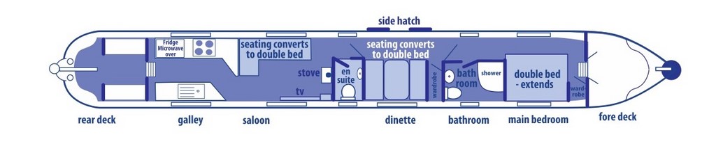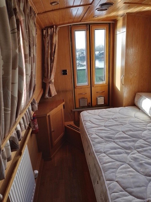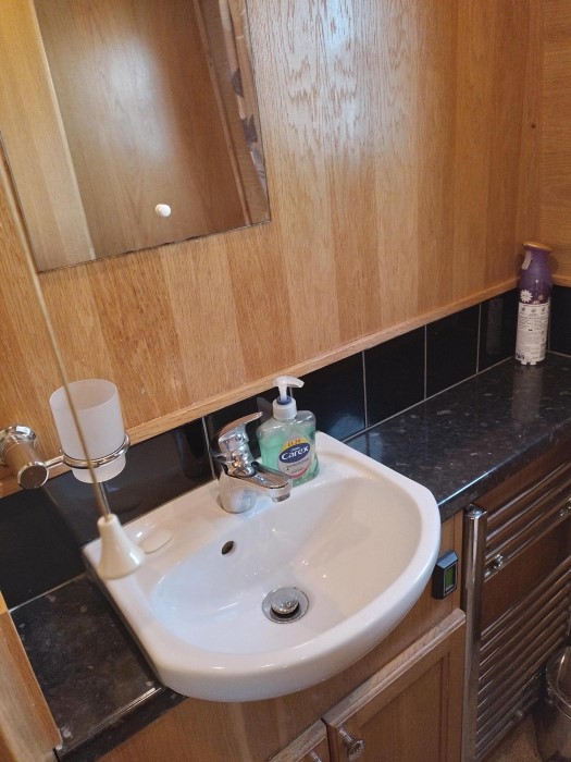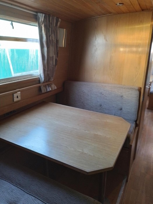 The kitchen is well equipped with full size 'fridge, oven, four burner hob, microwave and filtered drinking water. There is generous leisure battery provision supporting a 240 volt inverter. The kitchen itself is finished with wood worktops and inset bowl. The boat is equipped with enough crockery, glass tumblers, wine glasses and cutlery for six people. There are also appropriate pots, pans and cooking utensils.