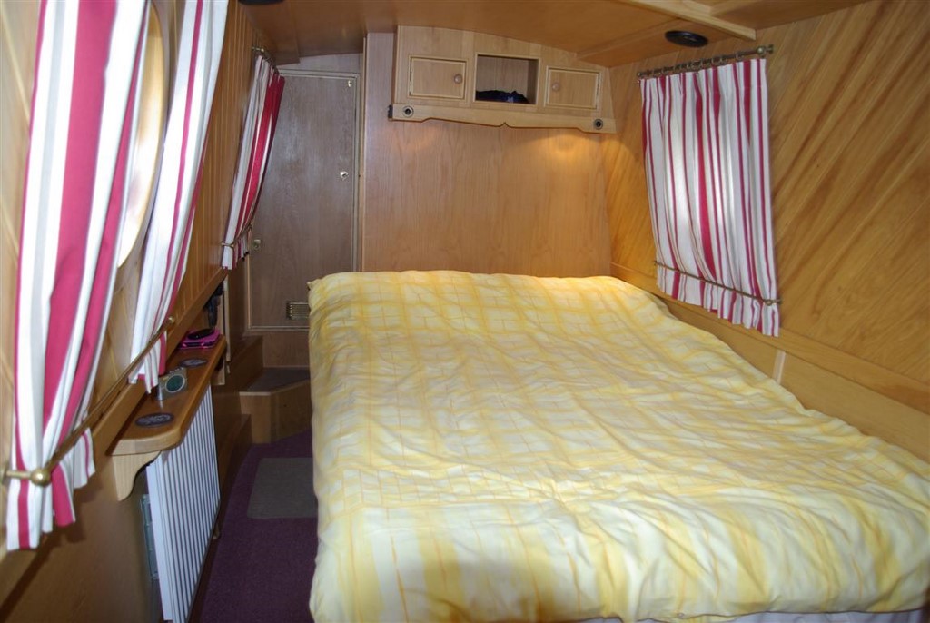 From the rear a trad-style stern with unique sliding/lifting hatch which opens to a good dry room housing coats, tools, mooring pins etc. It also houses a fitted battery charger and battery management system, land-line point and lifebelt on rack. Downstairs to the left is a large storage/broom cupboard with double doors. The bedroom has a fixed double bed that can extend to 5ft.