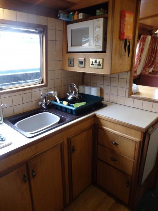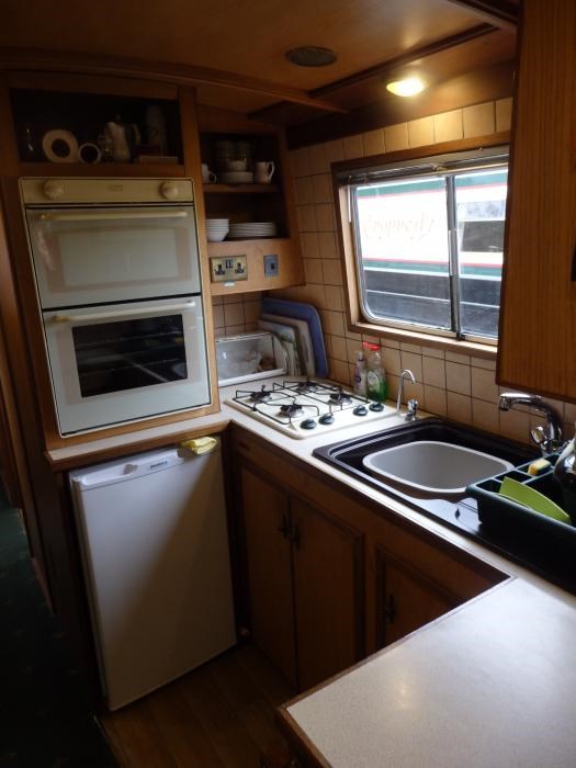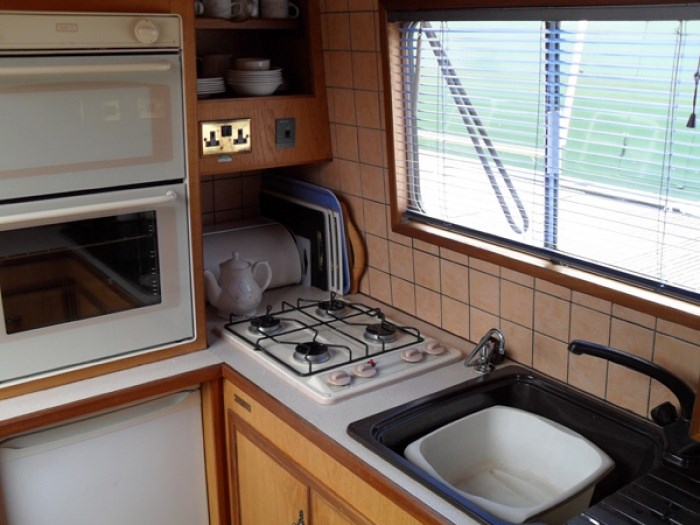Plenty of cupboards and equipped with enough crockery, cutlery, glasses for 6 people plus pans, pots and cooking utensils. There is a side double door access hatch for separate access to the boat and a 'Perspex' window can be fitted to give extra light without draft if required.