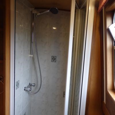 The main bathroom is in the middle of the boat and has a toilet, large shower and washbasin with under sink storage, mirrored cabinet and shelving.