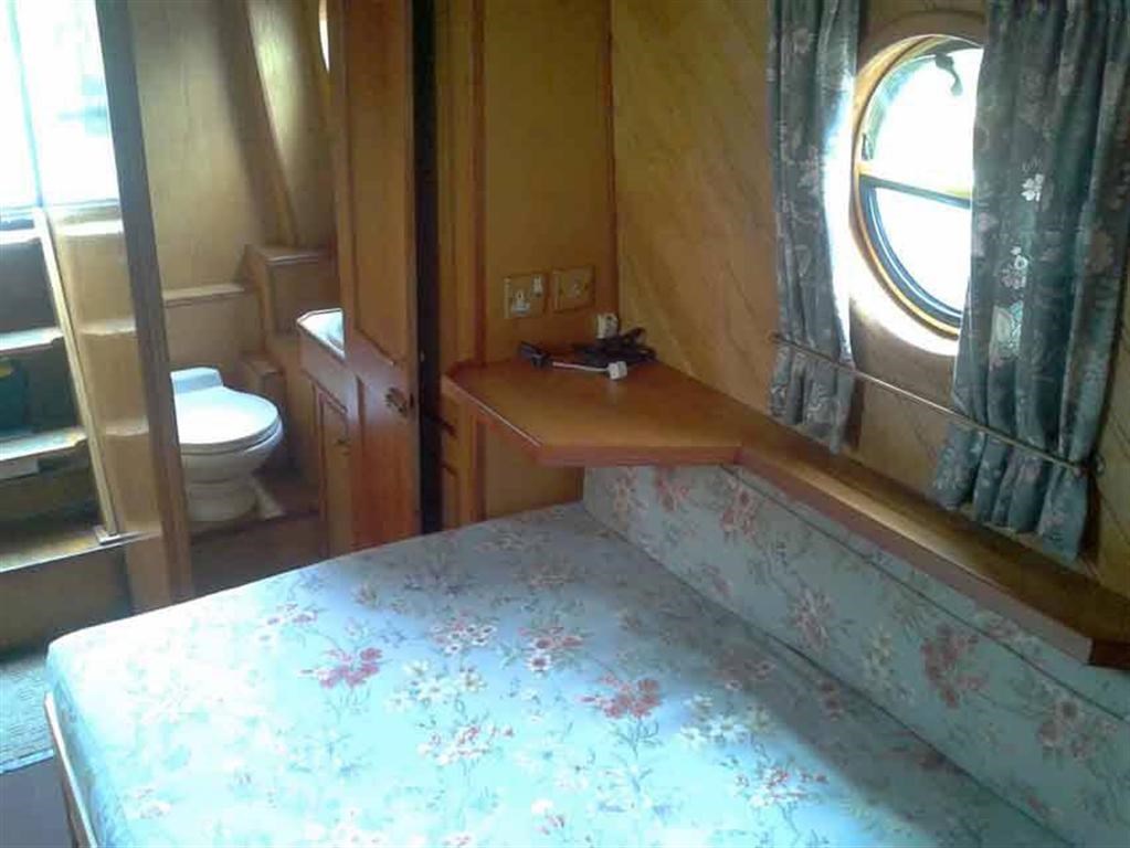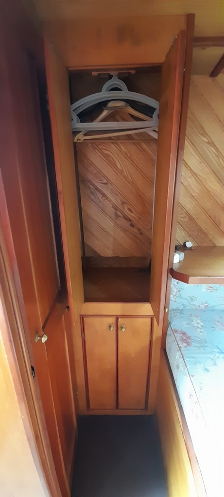 The saloon has a modesty curtain and 2 large comfortable armchairs which convert to beds. There is a flat-screen TV with DVD, a radio and a solid fuel stove. This area also has a full height wardrobe and drawer space.