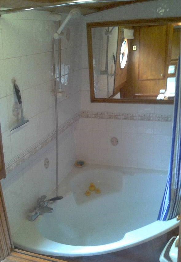 Beyond the privacy door is the gas central heating boiler (concealed by the opened door) and the bathroom to the left with corner bath, shower and full width mirror, radiator, wash basin, pump-out loo, storage and extractor fan.
