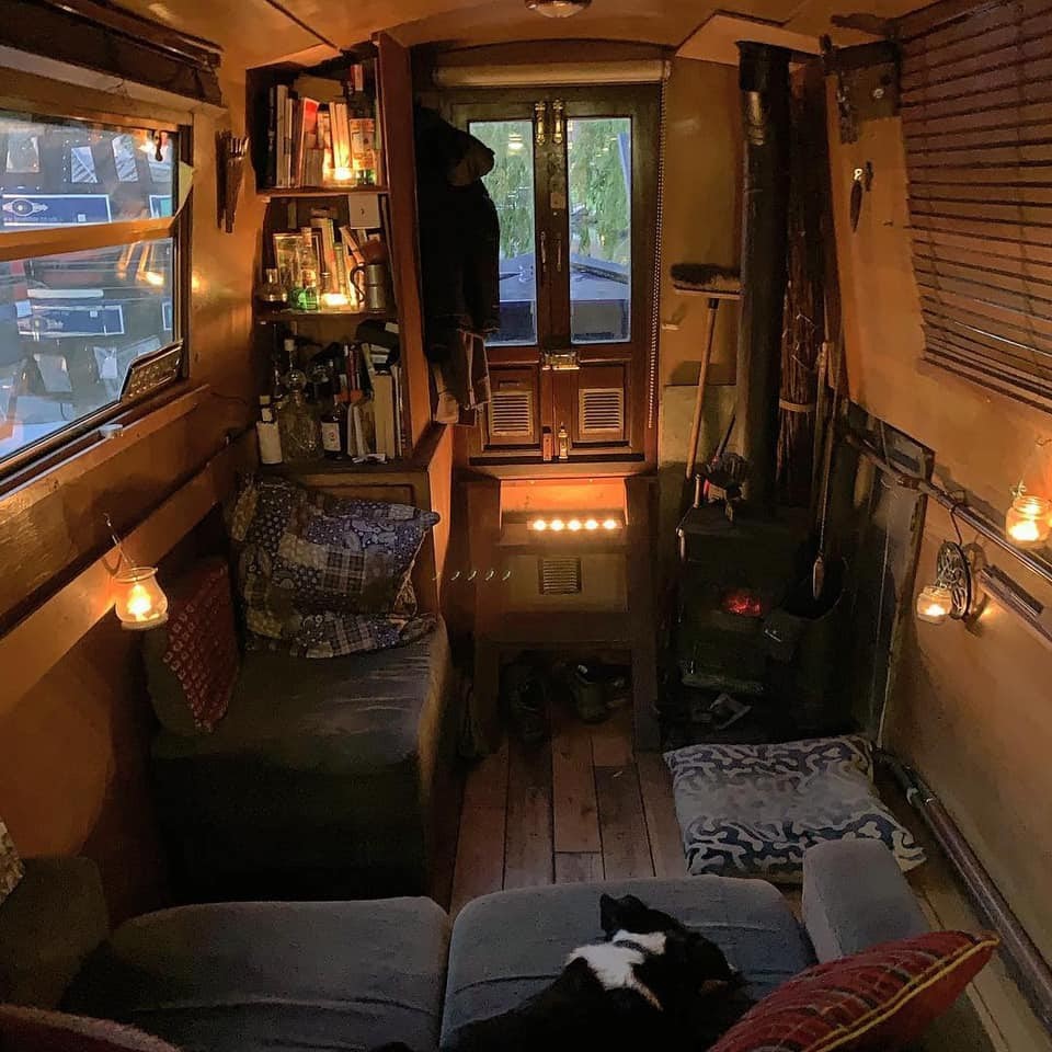 Entering through the bow double doors and down three steps you enter the 'living room' with two large windows allowing light in. Immediately to your left there is a Morso Squirrel multifuel stove with a back boiler (overhauled professionally in 2020) with twin lined flue (replaced in 2020) which feeds two convection-fed radiators toward the stern of the boat. There is also a stove fan on top of the stove to circulate air around the boat to keep all areas warm through the cooler months.