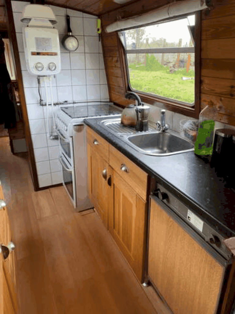 There’s a ‘through’ galley with storage both sides / sink / gas oven / gas fridge / paloma (another superb piece of kit) instant hot water heater and an all-round nice place to cook (I’ve cooked many a roast dinner easily).