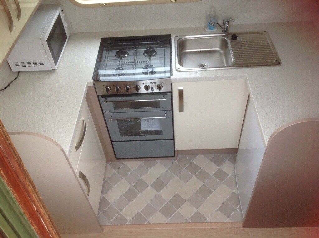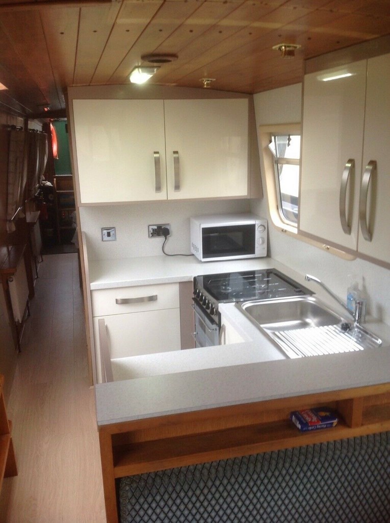 GALLEY: Gas cooker with 4-burner hob, grill and oven. Microwave. fridge with freezer compartment. Sink and drainer. Opening side hatch opposite.