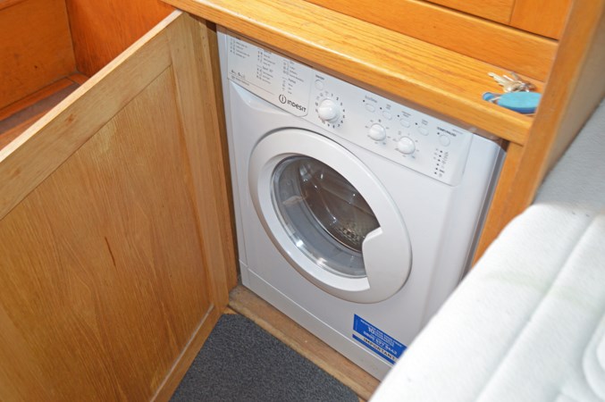 Starting from the semi-traditional rear deck, there are 2 storage lockers with seating and the control / instrument panel before dropping down the steps to enter the main bedroom, which is equipped with a 4’6’’ x 6’3’’ fixed double bed,  above bed shelf with built in reading lights and storage cupboard above rear of bed. There is further storage in a wardrobe with half height hanging and a hidden washing machine/ tumble dryer with large storage cupboard above. The steps up to the rear deck have easy access storage space in them.